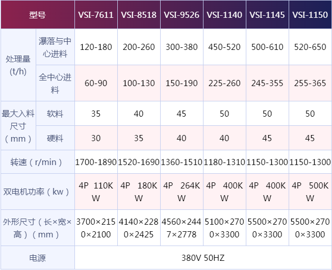 vsi沖擊式制砂機(jī)有好多種不一樣的規(guī)格型號,而每種型號的打沙機(jī)搭配的電動(dòng)機(jī)、機(jī)械的轉(zhuǎn)速、所能解決的物料的粒度范圍和機(jī)械的總重量等是不一樣的,技術(shù)參數(shù)是用戶選購機(jī)械時(shí)的重要參數(shù)資料,關(guān)于vsi沖擊式制砂機(jī)的詳細(xì)參數(shù)請看下文技術(shù)參數(shù)表。