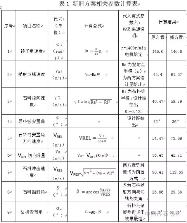 新舊方案的參數(shù)變化,導(dǎo)致了石料沖擊速度VRES和拋射角β的不同。為獲得佳的碰撞破碎效果,布置在機(jī)身腔壁的砧板的安置角α相應(yīng)作調(diào)整。兩個方案相關(guān)參數(shù)的計算過程見表1。