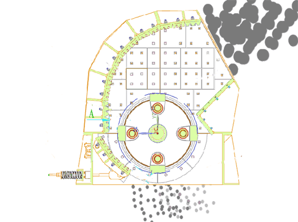 傳統(tǒng)的錘式破碎機(jī)一般通過不同縫隙大小的篦板來對骨料的細(xì)度進(jìn)行控制,其出料模式為:將篦板安裝于破碎機(jī)腔的下部,當(dāng)物料在破碎機(jī)腔內(nèi)經(jīng)過反復(fù)破碎后,符合出料粒度的物料