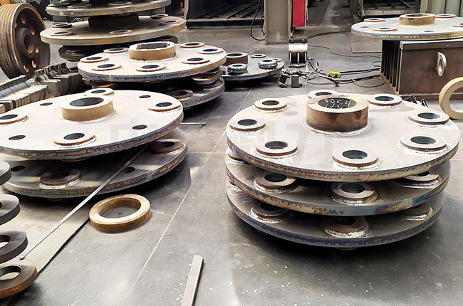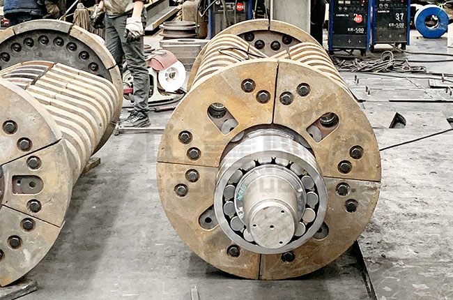 1、轉(zhuǎn)子:轉(zhuǎn)子是由主軸、錘架、圓盤(pán)、錘頭、銷(xiāo)軸等部件構(gòu)成,是重型錘式破碎機(jī)的主要工作部件。該轉(zhuǎn)子是支撐在兩個(gè)調(diào)心滾動(dòng)的軸承上面的,圓盤(pán)上面有分布均勻的銷(xiāo)孔,通過(guò)銷(xiāo)軸來(lái)將錘頭給懸掛在轉(zhuǎn)子上面,且為了防止錘架和錘頭的晃動(dòng),需在錘架兩端壓緊錘盤(pán)或?qū)⒙菽妇o固。