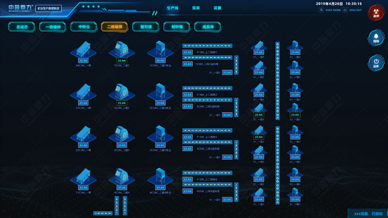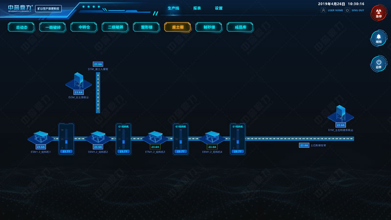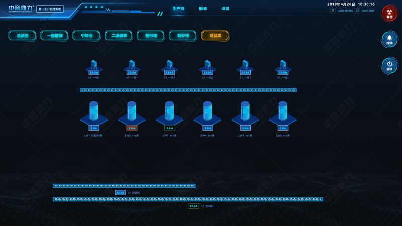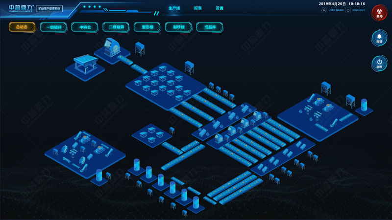 礦山生產(chǎn)管理系統(tǒng)三維形式展現(xiàn)整個(gè)生產(chǎn)線,可遠(yuǎn)程控制砂石骨料線的給料機(jī)、破碎機(jī)、皮帶機(jī)、制砂機(jī)、振動(dòng)篩等各設(shè)備的啟停,通過傳感裝置感知設(shè)備運(yùn)行狀態(tài)(如設(shè)備溫度、電壓、電流、振頻等數(shù)據(jù)),可監(jiān)測生產(chǎn)線產(chǎn)量、各儲(chǔ)料倉料位高度等信息,自動(dòng)生成報(bào)表,實(shí)現(xiàn)礦山生產(chǎn)環(huán)節(jié)的智能化操控管理及生產(chǎn)決策。