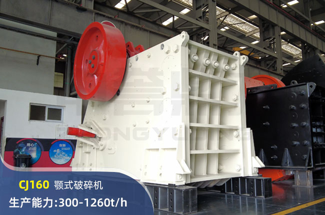CJ160顎式破碎機進料口尺寸1600×1200mm,進料粒度960mm,出料大小150-300mm,電機功率250kw,時產(chǎn)可達1260噸。