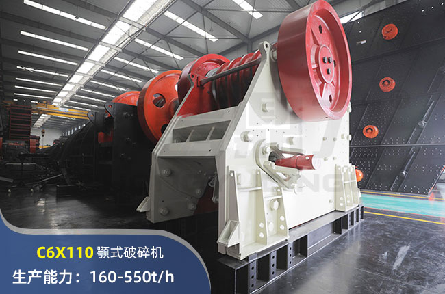 C6X110顎式破碎機(jī)進(jìn)料口尺寸850×1100mm,進(jìn)料粒度≤850mm,出料大小≤80mm,電機(jī)功率160kw,時(shí)產(chǎn)550噸。