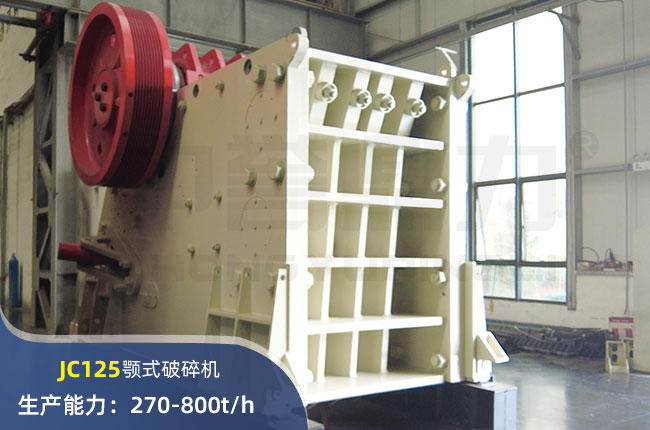 JC125顎式破碎機進料口尺寸1250-950mm,進料粒度≤810mm,出料大小≤100mm,電機功率160kw,時產量在800噸左右。
