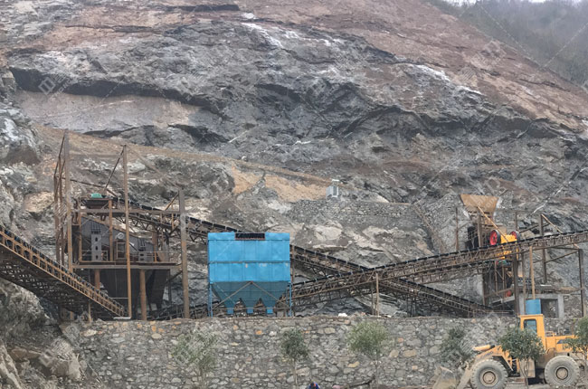 設備配置:DLZGC1250P振動給料機、DLEV106顎式破碎機、DLPF1820反擊式破碎機、3YK3072振動篩(2臺)、B1200x28米輸送機、B1200x43米輸送機等。