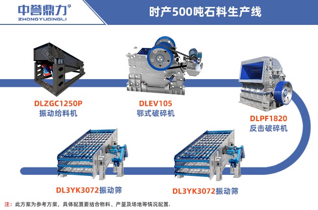 配置說明:配套設備給料機、振動篩型號可以容易選擇,只要時產(chǎn)量夠500噸就可以,包括其他主要設備顎式破碎機、圓錐破碎機也是一樣,因為是硬巖生產(chǎn)線,圓錐破也可以換成雙腔硬巖破,如果用反擊破板錘或其他零部件磨損相對嚴重,后期維護成本較高。