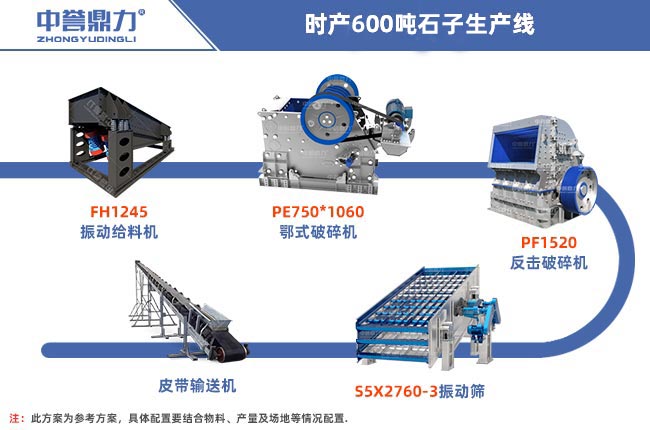 工藝介紹:上面這條時產600噸碎石生產線配置采用常見的顎式破碎機作為一破設備,二破用的是反擊式破碎機,也可以換成圓錐破碎機。搭配比較靈活,其他配套設備型號也不固定,只要產量達標都可以的,另外可以配備脈沖袋式除塵器進行除塵,減少粉塵污染。