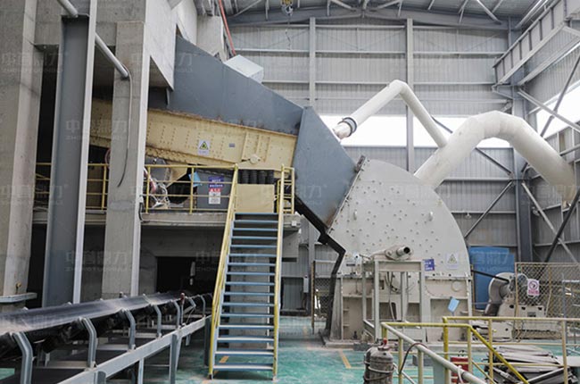 設(shè)備配置:PCZ1820重型錘式反擊破碎機(jī)、PC1622整形式破碎機(jī)、3YKZ3680振動(dòng)篩、脈沖袋式除塵器及智能化管理系統(tǒng)等。
