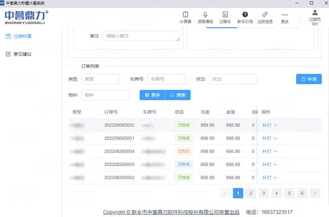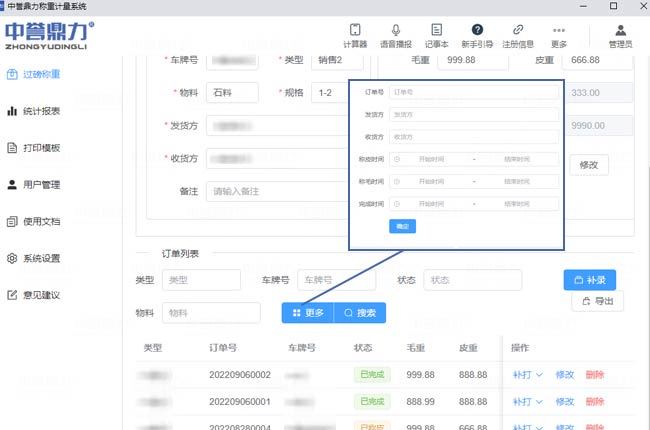 登錄賬號(hào),過(guò)磅稱重界面根據(jù)需求可按照類型、車牌號(hào)、狀態(tài)、物料、時(shí)間等篩選數(shù)據(jù)。可根據(jù)需求調(diào)出過(guò)磅記錄。