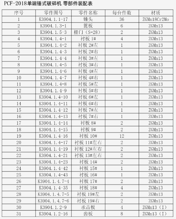2018單段錘式破碎機(jī)有36個(gè)錘頭,采用ZGMn18Cr2Mo材質(zhì),即高錳鋼錘頭。