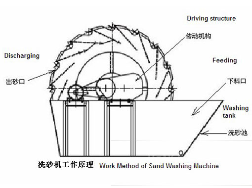 輪斗式洗砂機(jī)主要結(jié)構(gòu)包括洗砂池、輪斗、電機(jī)、下料口等組成,輪斗洗砂機(jī)工作的時(shí)候電機(jī)通過(guò)三角帶、減速機(jī)、齒輪減速后帶動(dòng)葉輪緩慢轉(zhuǎn)動(dòng),砂石由給料槽進(jìn)入洗砂池中,在葉輪的帶動(dòng)下翻滾,并互相研磨,除去覆蓋砂石表面的雜質(zhì),同時(shí)破壞包覆砂粒的水汽層,以利于脫水。同時(shí)加水,形成較強(qiáng)大的水流,及時(shí)將雜質(zhì)及比重小的異物帶走,并從出砂口排出,從而完成清洗作用。干凈的砂石由葉片帶走, 后砂石從旋轉(zhuǎn)的葉輪倒入出料槽,完成砂石的清洗作用。