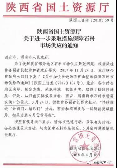 為了緩解我省部分地區(qū)石料市場(chǎng)供應(yīng)緊張問(wèn)題,根據(jù)梁桂常務(wù)副省長(zhǎng)批示和省要求,2017年11月24日,我廳聯(lián)合省七部門下發(fā)了《關(guān)于加快推進(jìn)采石礦山整治保障石料市場(chǎng)供給的通知》(陜土資發(fā)[2017]107號(hào))。此后,各市結(jié)合地區(qū)實(shí)際,制定方案,采取措施,積落實(shí),取得了階段性進(jìn)展。但是,從目前實(shí)際效果來(lái)看,西安、渭南兩市石料市場(chǎng)需求缺口較大。3月24日,梁桂常務(wù)副省長(zhǎng)再次批示:“持續(xù)推進(jìn)‘開(kāi)前門、堵后門’措施,西安和渭南要盡所能僵局。相關(guān)進(jìn)展6月份前再報(bào)”。