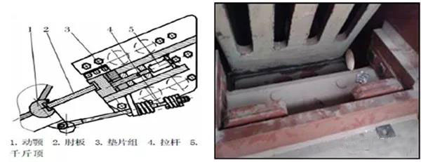 顎板的大小,中間一塊較小,上下兩塊較大,上面也有一個楔形的東西,叫做固定楔塊或固定壓鐵。顎板靠螺栓固定在中間一塊顎板和壓鐵上。