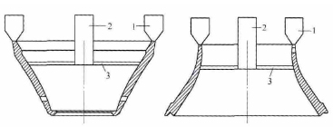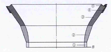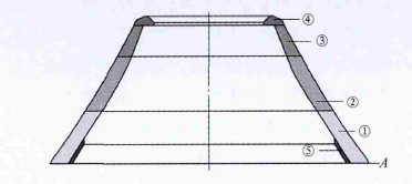 (1)模樣制作工藝CH660單缸圓錐破碎機(jī)動(dòng)錐、定錐襯板采用消失模分部制作粘合整體手工修正模樣制作完成。須工序合理,定位選擇準(zhǔn)確,模樣垂直度和同軸度要求。動(dòng)錐襯板:按圖1所示工藝制作模樣,在圓周方向六等分,高度方向分5部分進(jìn)行樣板放樣,分部制作模樣;以A 面為基準(zhǔn),逐步粘合①~⑤部分,校準(zhǔn)各部分模樣同軸度;按工藝圖要求進(jìn)行整體手工修整,模樣準(zhǔn)確與完整。定錐襯板:按圖2所示工藝制作模樣,在圓周方向六等分,高度方向分三部分進(jìn)行樣板放樣,制作模樣;以B 面及內(nèi)外徑為基準(zhǔn),先對①、②、③主體部分粘合校正,再粘合法蘭④,整體校正后,后分度粘合12個(gè)定位銷⑤。按工藝圖要求進(jìn)行整體手工修模。