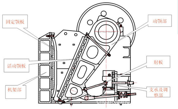 雙肘板顎破機(jī)的工作方式主要是通過往復(fù)運(yùn)動由肘板連桿機(jī)構(gòu)達(dá)成,該工作方式使影響力較好地從驅(qū)動系統(tǒng)傳遞到工作元件,因此,這類碎石機(jī)比較適應(yīng)于破碎提高莫氏硬度和韌性的