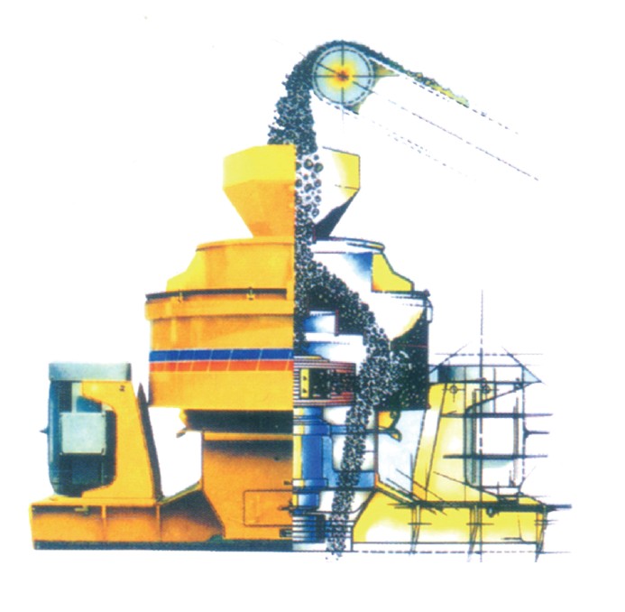 砂石物料由機器上部垂直落入高速旋轉(zhuǎn)的葉輪內(nèi),在高速離心力的作用下,與另一部分 以傘狀形式分流在葉輪四周的物料產(chǎn)生高速撞擊與粉碎,物料在互相撞擊后,又會在葉輪和機殼之間以物料形成渦流多次的互相撞擊、摩擦而粉碎,從下部直通排出,形成閉路多次循環(huán),由篩分設(shè)備控制達到所要求的成品粒度。