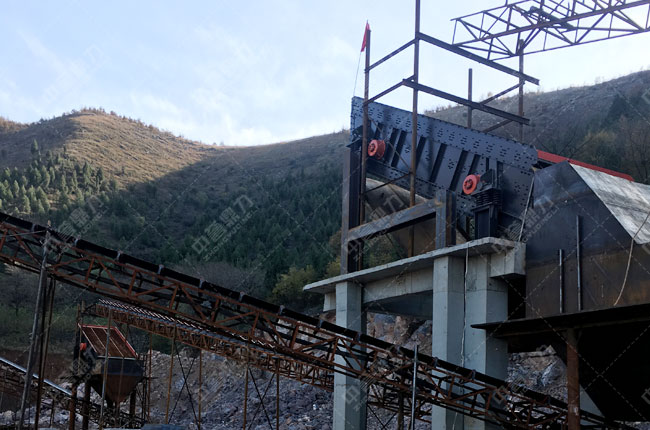 石灰石原料由重型錘式破碎機(jī)進(jìn)行粗碎,破碎后大于31mm的石料由皮帶機(jī)送至1216整形機(jī)二次破碎;破碎后的石料經(jīng)3ykz40100篩分出來的小于1-3的料,會(huì)送至2ykz3070篩分,后篩分出1-2/0-5和石粉三種成品料。