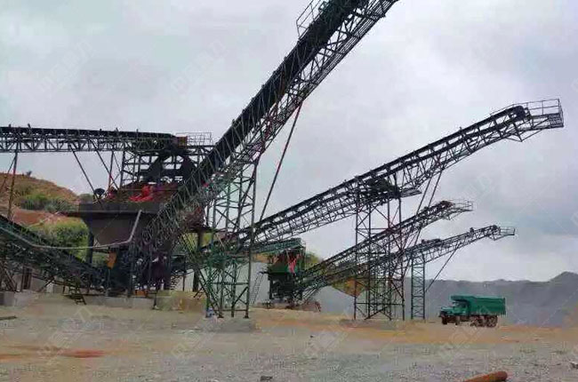 該條江西萍鄉(xiāng)時產(chǎn)800-1000噸石料生產(chǎn)線采用的PCZ1620重型錘式破碎機結(jié)構(gòu)設(shè)計合理,進入破碎腔內(nèi)的物料自上而下地經(jīng)歷先粗破,再中破,后細破的破碎工藝過程,實現(xiàn)了在一個機體內(nèi)同時多級連續(xù)破碎的工藝。不僅增大了破碎比,還減少了各種破碎設(shè)備和輔助設(shè)備的數(shù)量,縮小占用空間,能耗,減少投資和維護費用,給用戶帶來的經(jīng)濟效益。與其配套的YK系列振動篩篩分效果好,產(chǎn)量大,適合石料生產(chǎn)中的對物料的篩分分級作業(yè)。