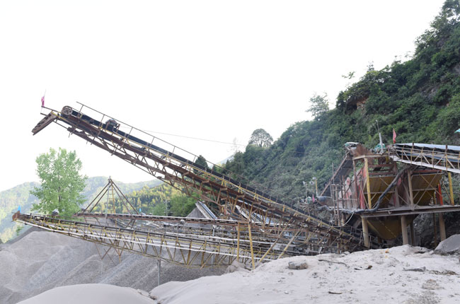石灰?guī)r原料通過(guò)原料倉(cāng),由振動(dòng)送料機(jī)均勻的將石料送至錘式破碎機(jī)進(jìn)行破碎加工,破碎后的石料經(jīng)頭道并排振動(dòng)篩進(jìn)行篩選,一部分符合粒度要求的石料被送至成品料堆,另一部分再由二道振動(dòng)篩進(jìn)行篩選,得到更細(xì)的石料。四川巴中匯山建筑石料廠這條日產(chǎn)2000噸砂石生產(chǎn)線,采用“1臺(tái)一破成型的錘式破碎機(jī)+4臺(tái)振動(dòng)篩”,只需一道破碎工序即可加工4種不同規(guī)格的石料,這樣的配置方案比較簡(jiǎn)單,占地面積小、設(shè)備配置少、設(shè)備易維護(hù)保養(yǎng)。