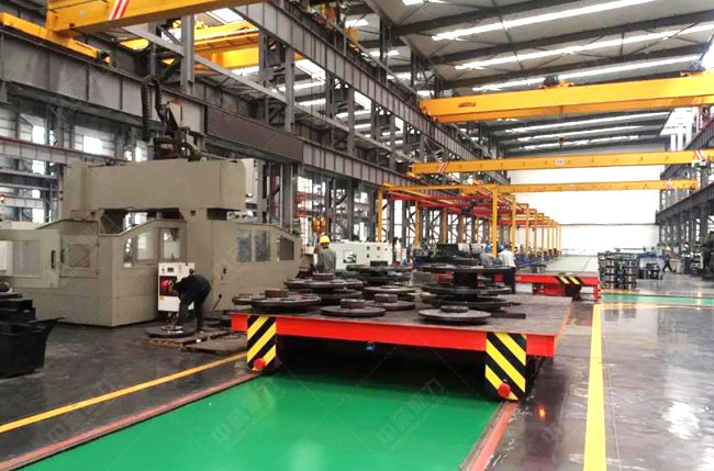 用于各個工位間的產(chǎn)品轉(zhuǎn)運,具有自動行走、自動移載功能;采用滑觸線取電,與工位臺之間采用掃描二位碼定位;與工位臺之間采用以太網(wǎng)無線通訊;主線方向上行走采用變頻調(diào)速,速度范圍0-40m/分鐘;橫向移載采用定速輸送產(chǎn)品,速度12m/分鐘;