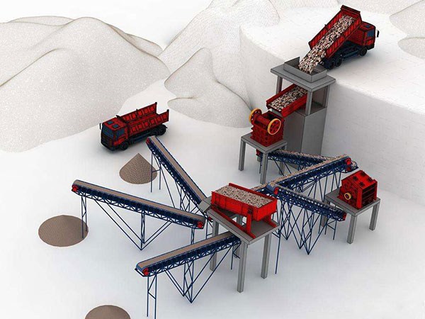 大塊礦石經(jīng)料堆由振動(dòng)喂料機(jī)均勻送入顎破進(jìn)行初級(jí)粉碎,初級(jí)粉碎后的礦石再由傳送設(shè)備運(yùn)輸給圓錐碎石機(jī)進(jìn)行中整型破碎,然后經(jīng)礦山振動(dòng)篩篩選分級(jí),大于40毫米的礦石重新返回圓錐碎石機(jī),40毫米以下的礦石由傳送設(shè)備送入打砂機(jī)進(jìn)行整形,整形后的成品經(jīng)由礦山振動(dòng)篩篩選分級(jí),由傳送設(shè)備運(yùn)輸至成品區(qū)。