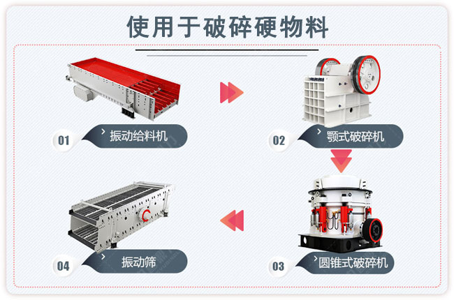 關鍵搭配機械:原料堆、ZSW490*110震動喂料機、HD98顎式破碎機、CS430圓錐式破碎機、4YK2460礦山振動篩、皮帶運送機若干(依據(jù)地形搭配)