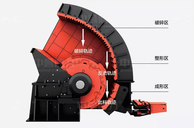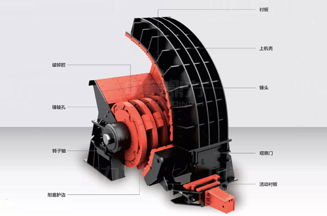 在物料進(jìn)入箱式破碎機(jī)后,經(jīng)過(guò)高速旋轉(zhuǎn)的錘頭沖擊而進(jìn)行破碎,破碎后的物料在錘頭處獲得動(dòng)能,高速?zèng)_向破碎襯板,同時(shí)相互撞擊,經(jīng)過(guò)多次破碎,小于篩條之間間隙的物料,就會(huì)從間隙中排出,較大的物料在篩條上再次經(jīng)過(guò)錘頭沖擊,直到可以被排出。