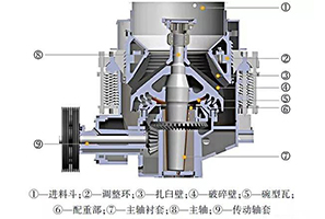 圓錐破碎機(jī)在工作時,電動機(jī)通過傳動裝置帶著偏心套旋轉(zhuǎn),動錐在偏心軸套的驅(qū)動下做旋轉(zhuǎn)擺動,在動錐靠近靜錐后,物料受兩者的多次擠壓和撞擊而破碎,待到物料被破碎至要求粒度,會在自身重力作用下下落,從錐底排出。